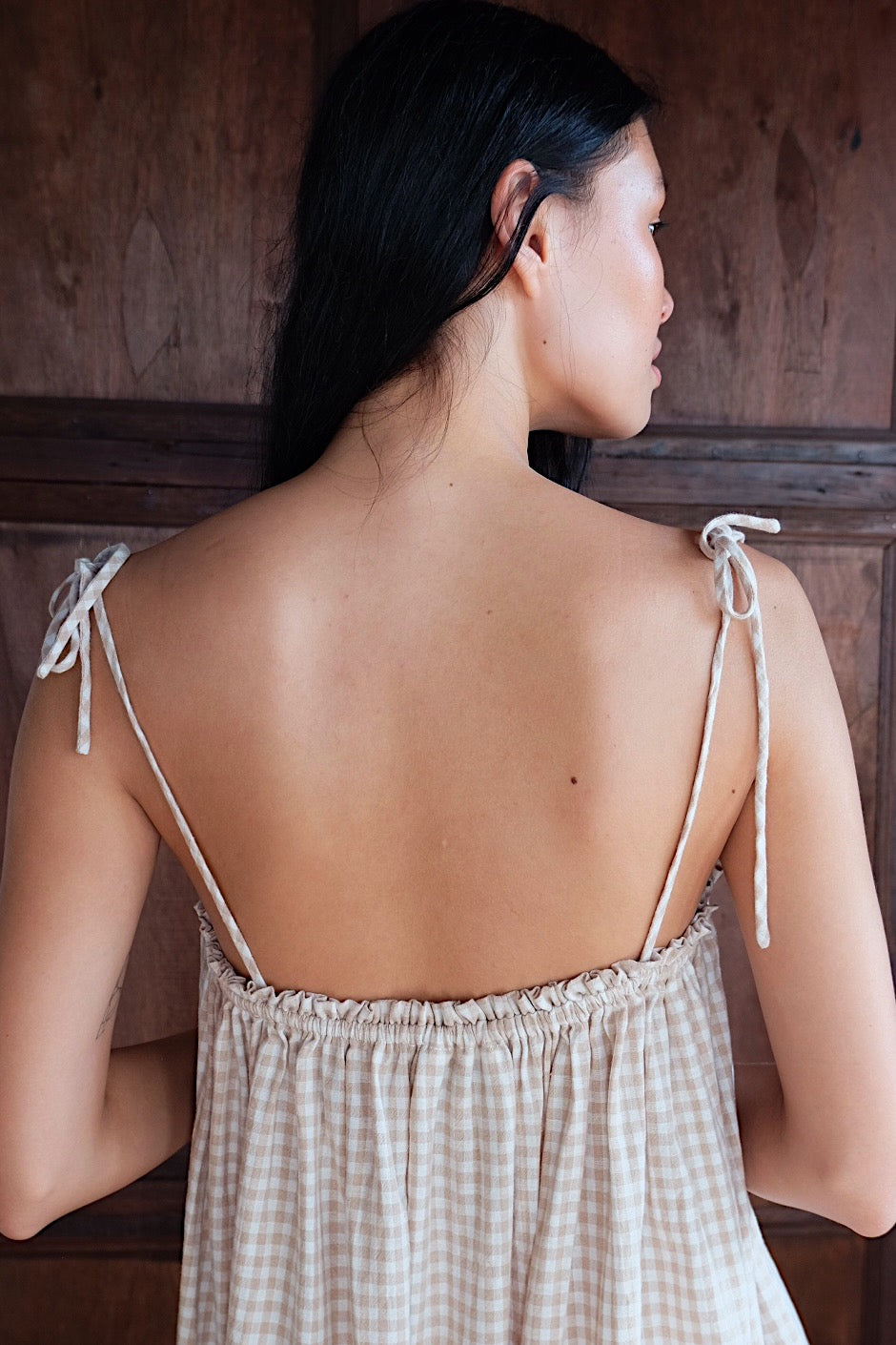 Biscuit is our soft beige gingham, created for pieces that feel easy, playful, and quietly feminine. The warm check pattern brings a gentle familiarity, while gathered details and adjustable ties add softness and movement to the silhouette.