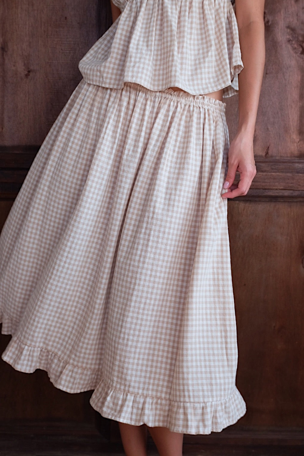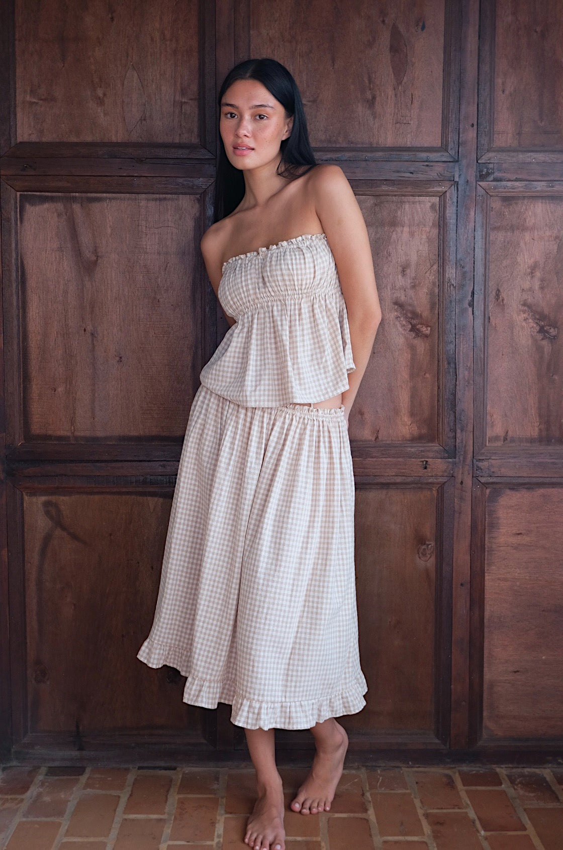 The Biscuit Ruffle Mini Dress features soft gathers and a relaxed silhouette that moves easily with the body. Adjustable shoulder ties and our warm beige gingham give it a playful yet effortless feel. The dress can be worn as a midi skirt as shown in the photos. Light and comfortable, it’s designed for everyday wear, easy to slip on for slow mornings, warm afternoons, and everything in between.