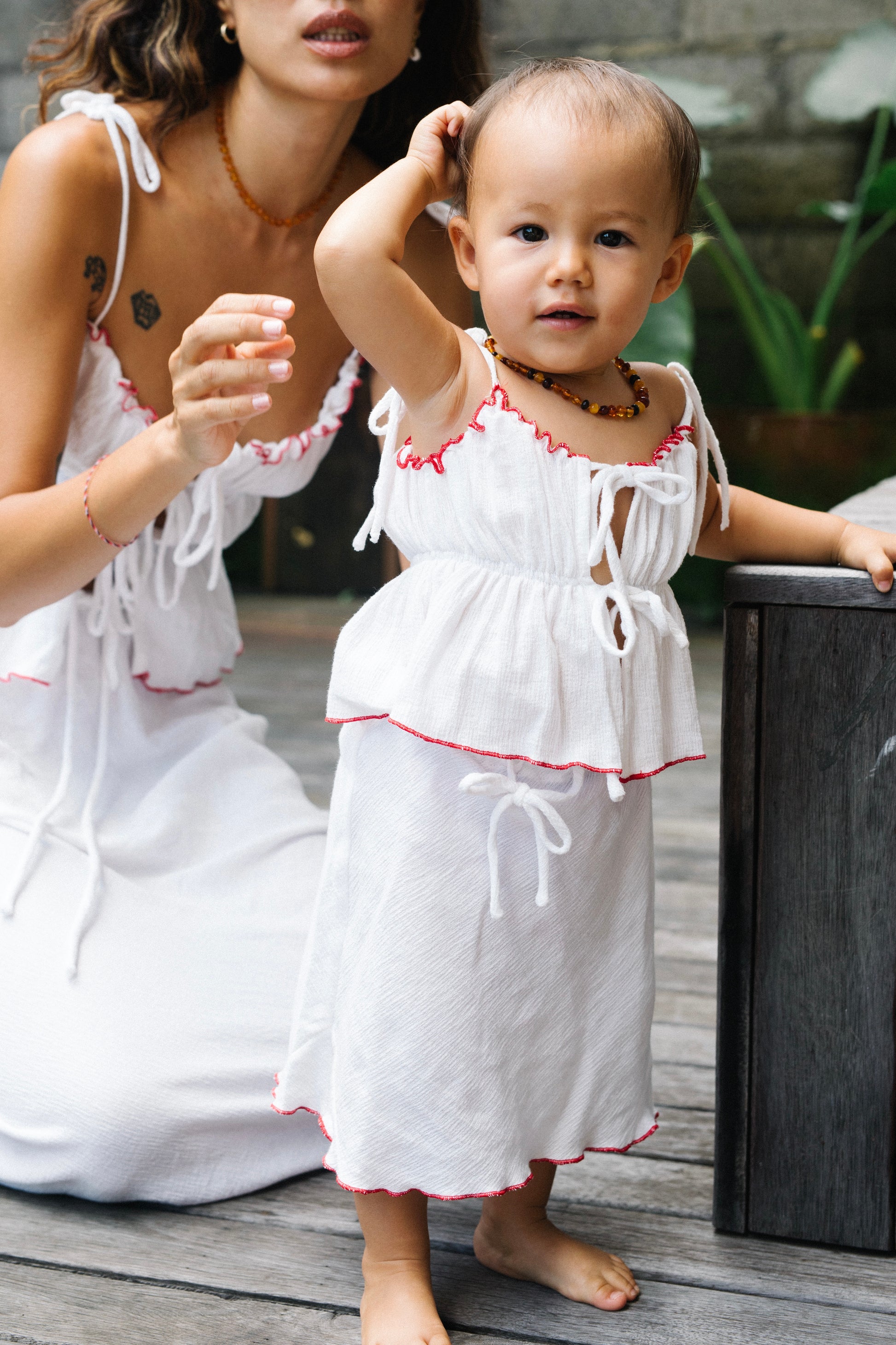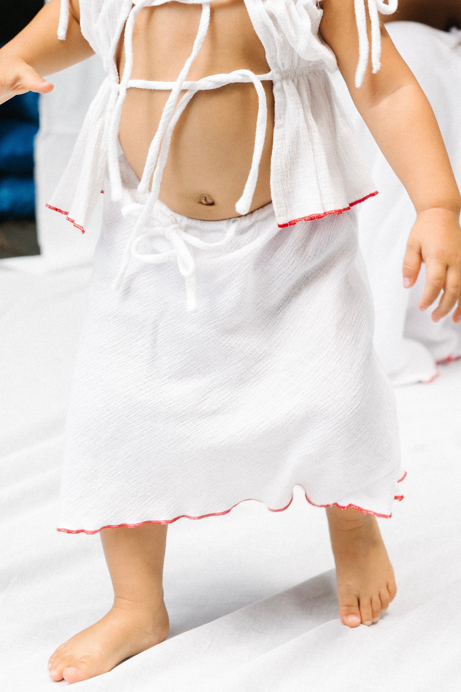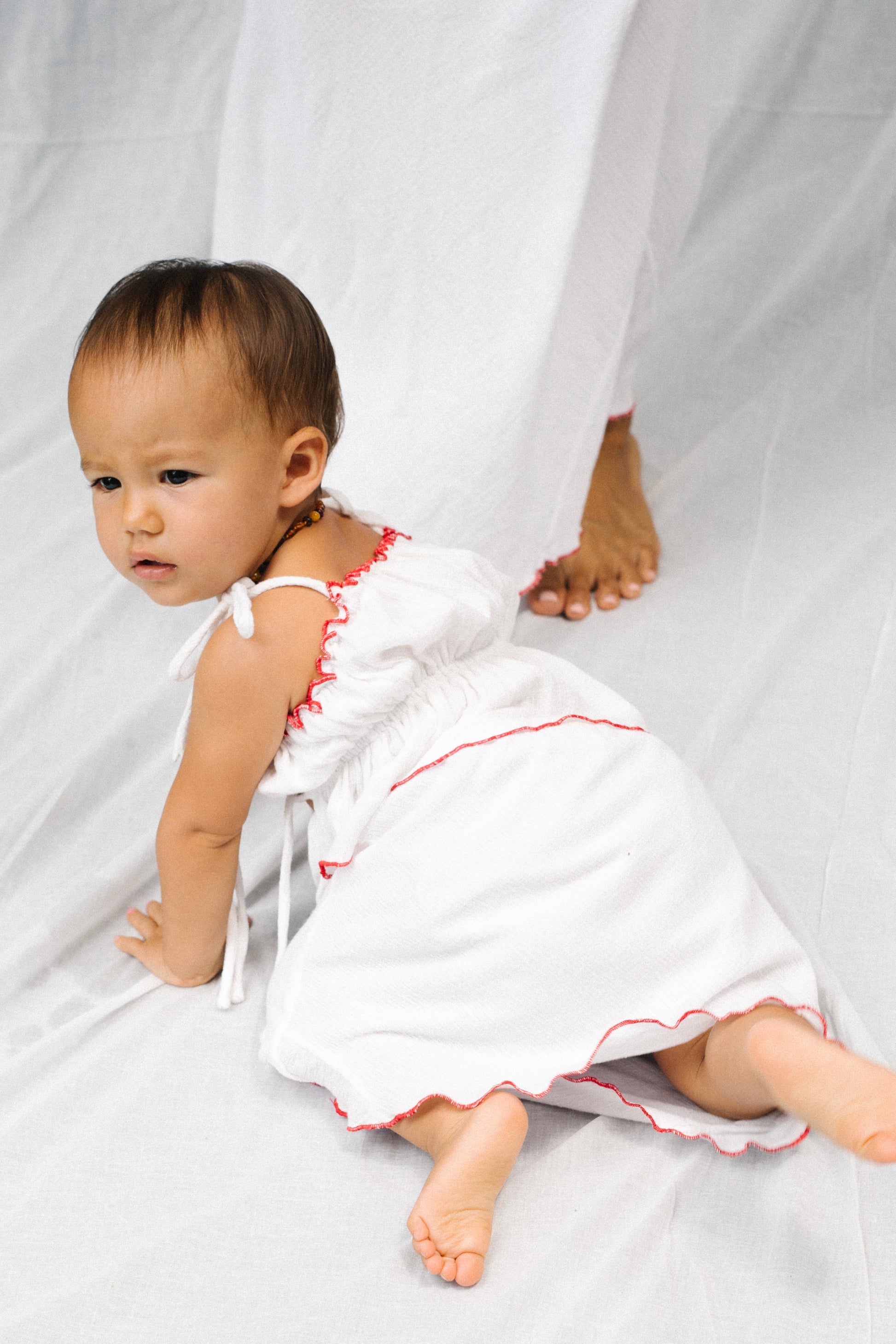 I chose this fabric because of the beautiful texture and durability & not too sheer compare to our other white pieces :) 'Kaba' is crafted from 100% cotton, ensuring it’s soft and comfortable all day long. The textured fabric adds a unique touch, while the playful red overlocking gives it a fun, colourful finish. The shirred sewing technique creates a cute and snug fit, making it perfect for everyone.