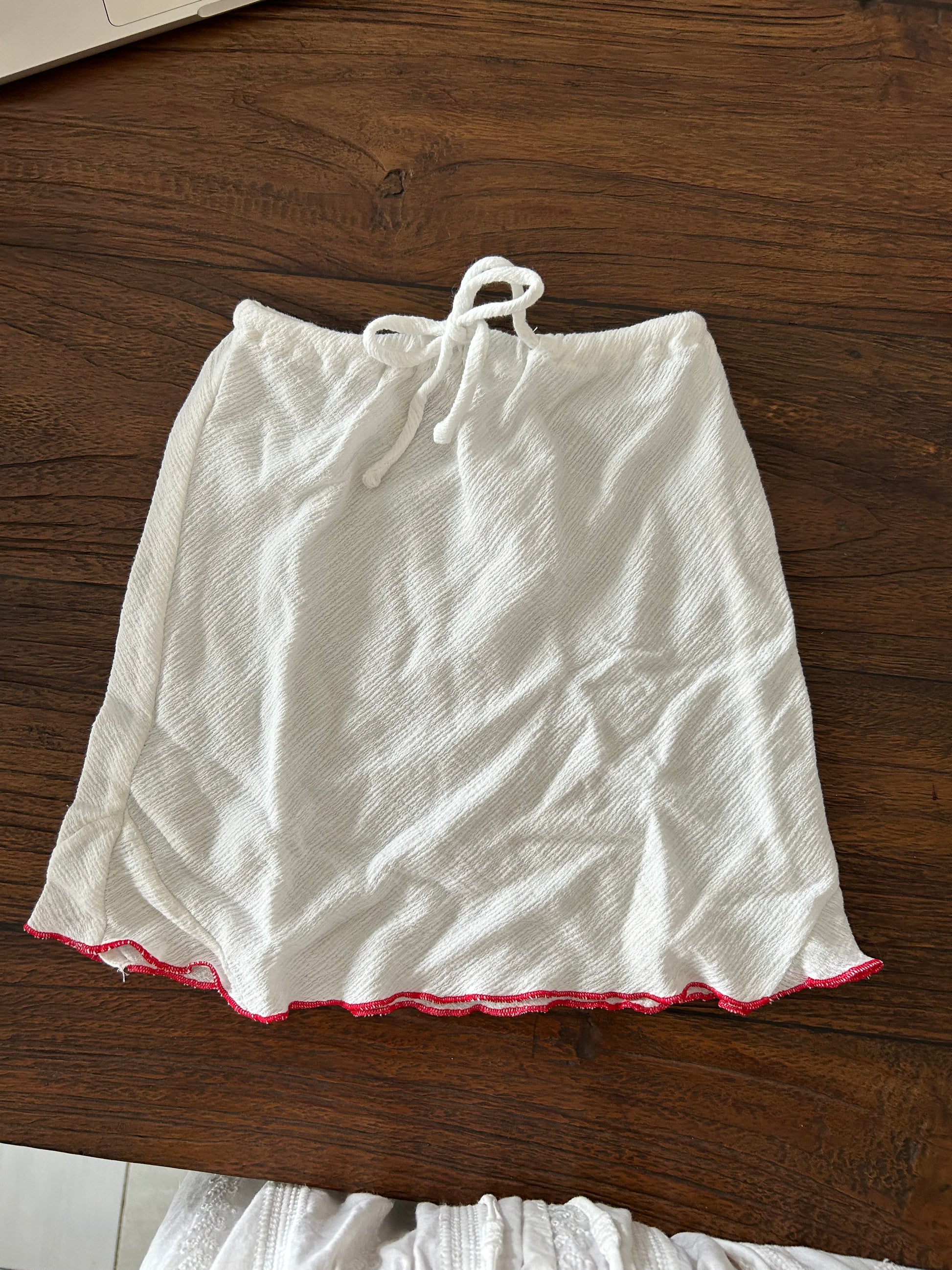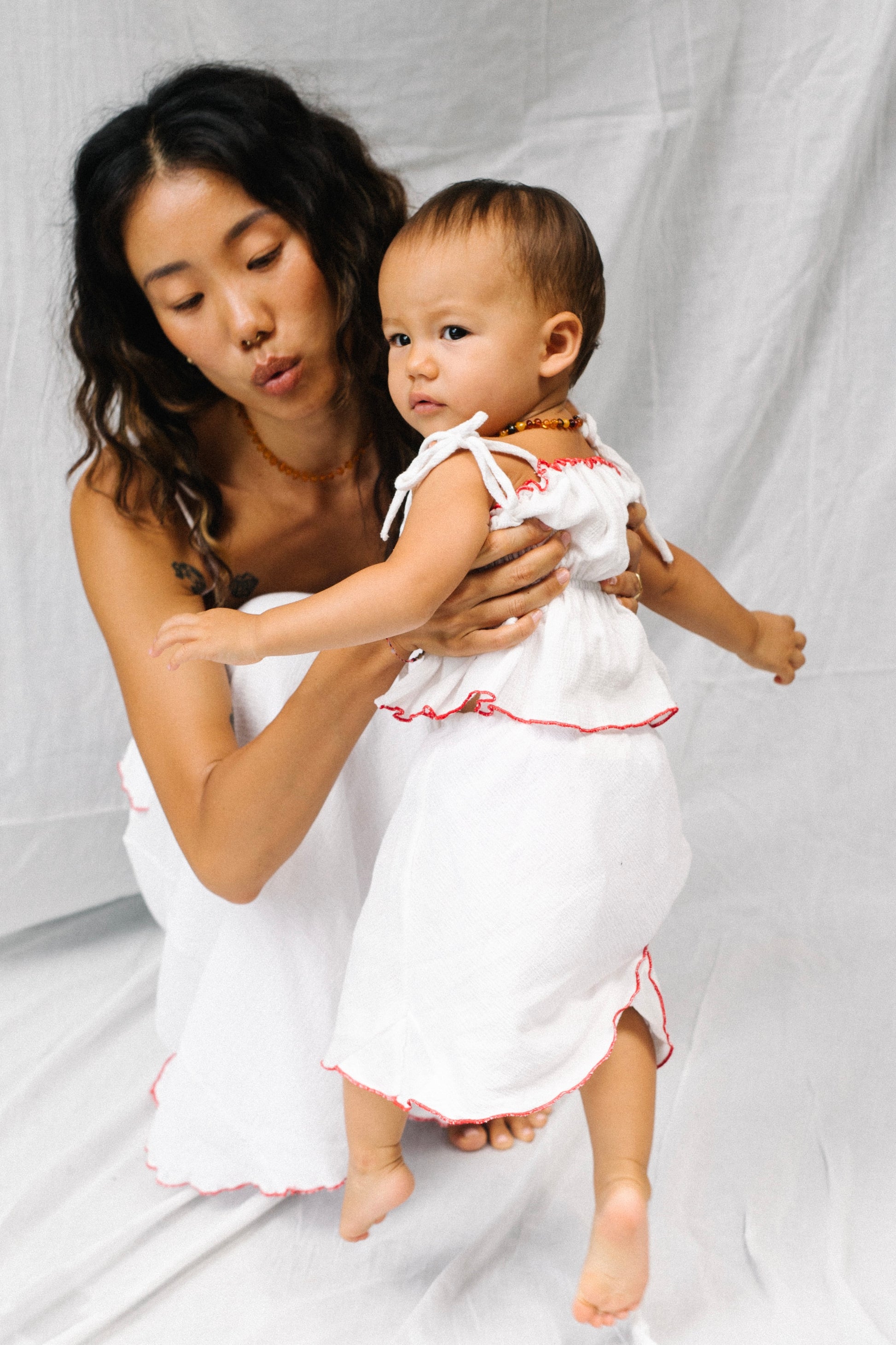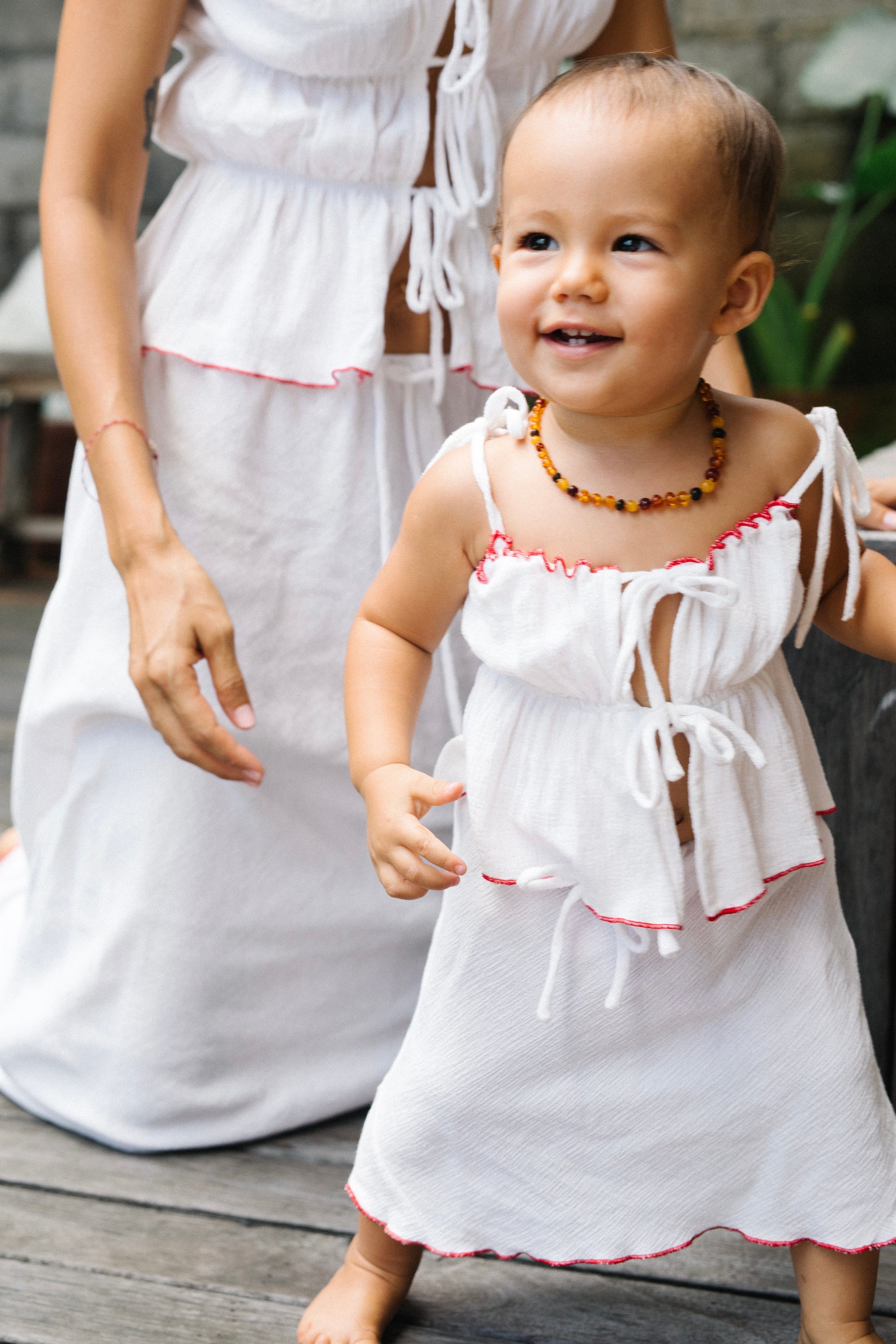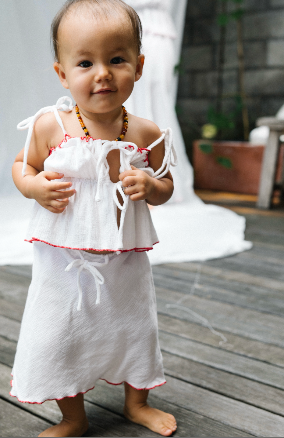 I chose this fabric because of the beautiful texture and durability & not too sheer compare to our other white pieces :) 'Kaba' is crafted from 100% cotton, ensuring it’s soft and comfortable all day long. The textured fabric adds a unique touch, while the playful red overlocking gives it a fun, colourful finish. The shirred sewing technique creates a cute and snug fit, making it perfect for everyone.