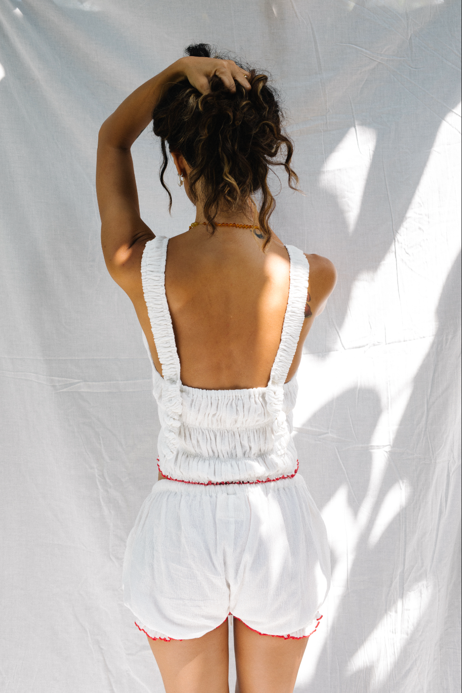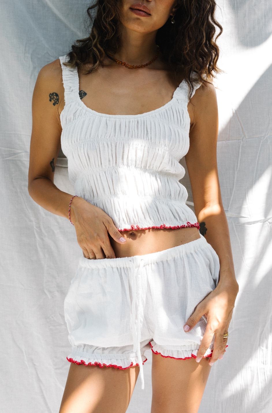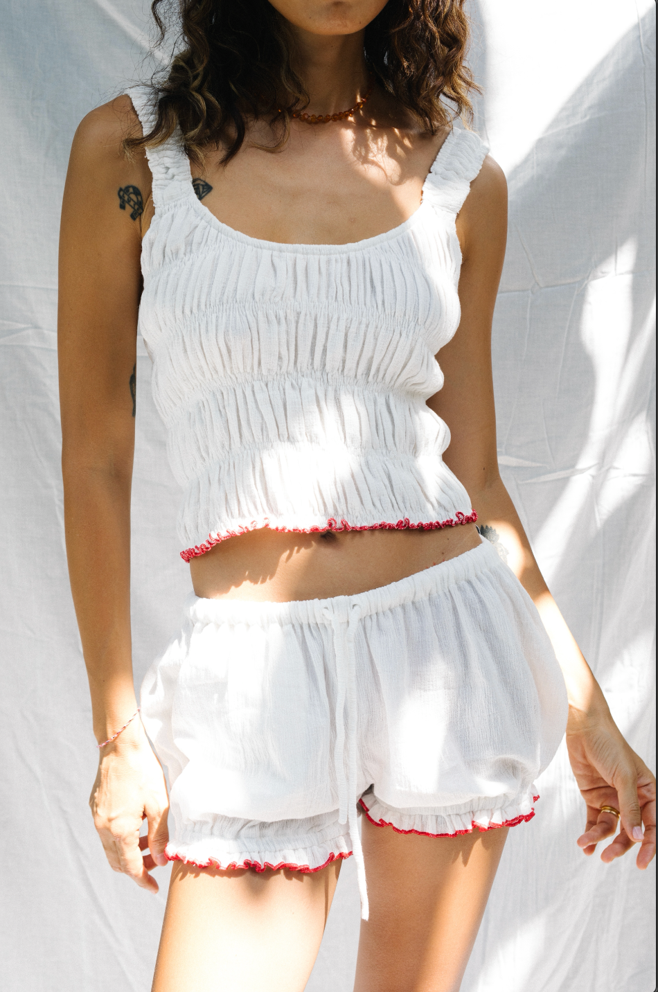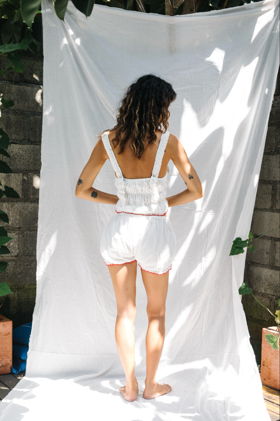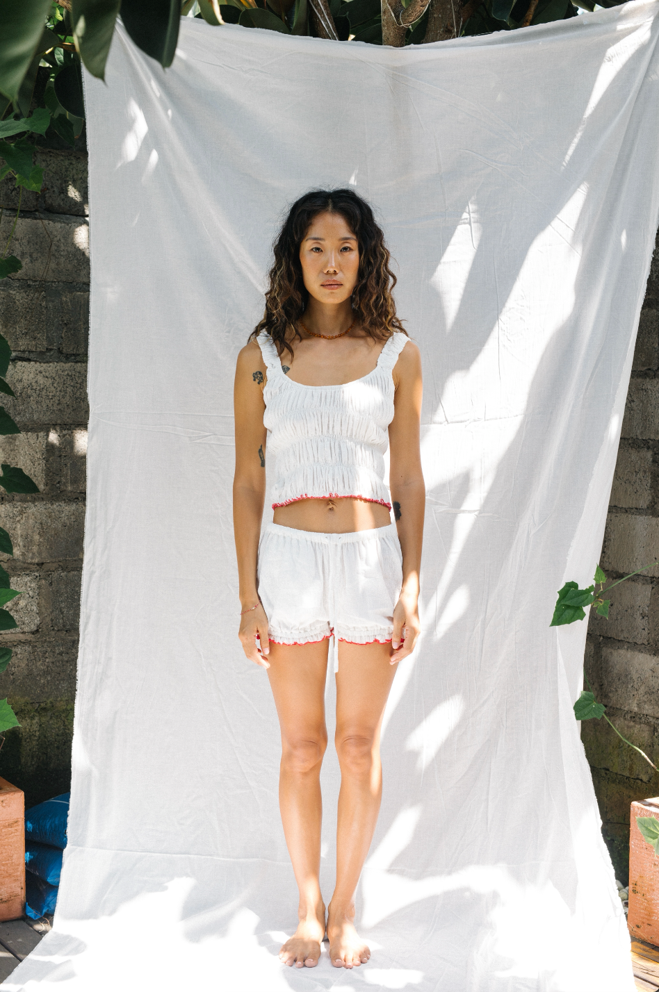 I chose this fabric because of the beautiful texture and durability & not too sheer compare to our other white pieces :) 'Kaba' is crafted from 100% cotton, ensuring it’s soft and comfortable all day long. The textured fabric adds a unique touch, while the playful red overlocking gives it a fun, colourful finish. The shirred sewing technique creates a cute and snug fit, making it perfect for everyone.
