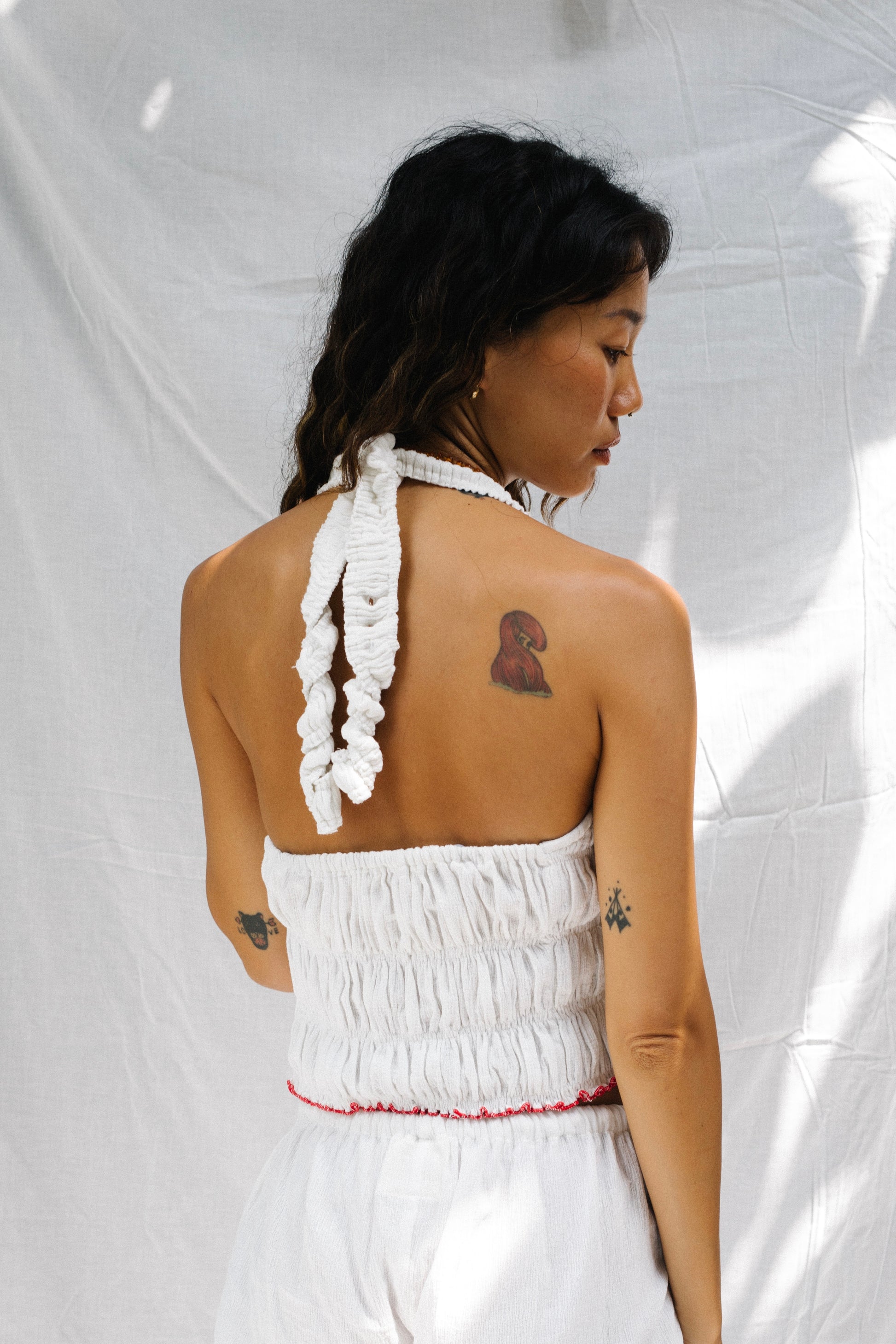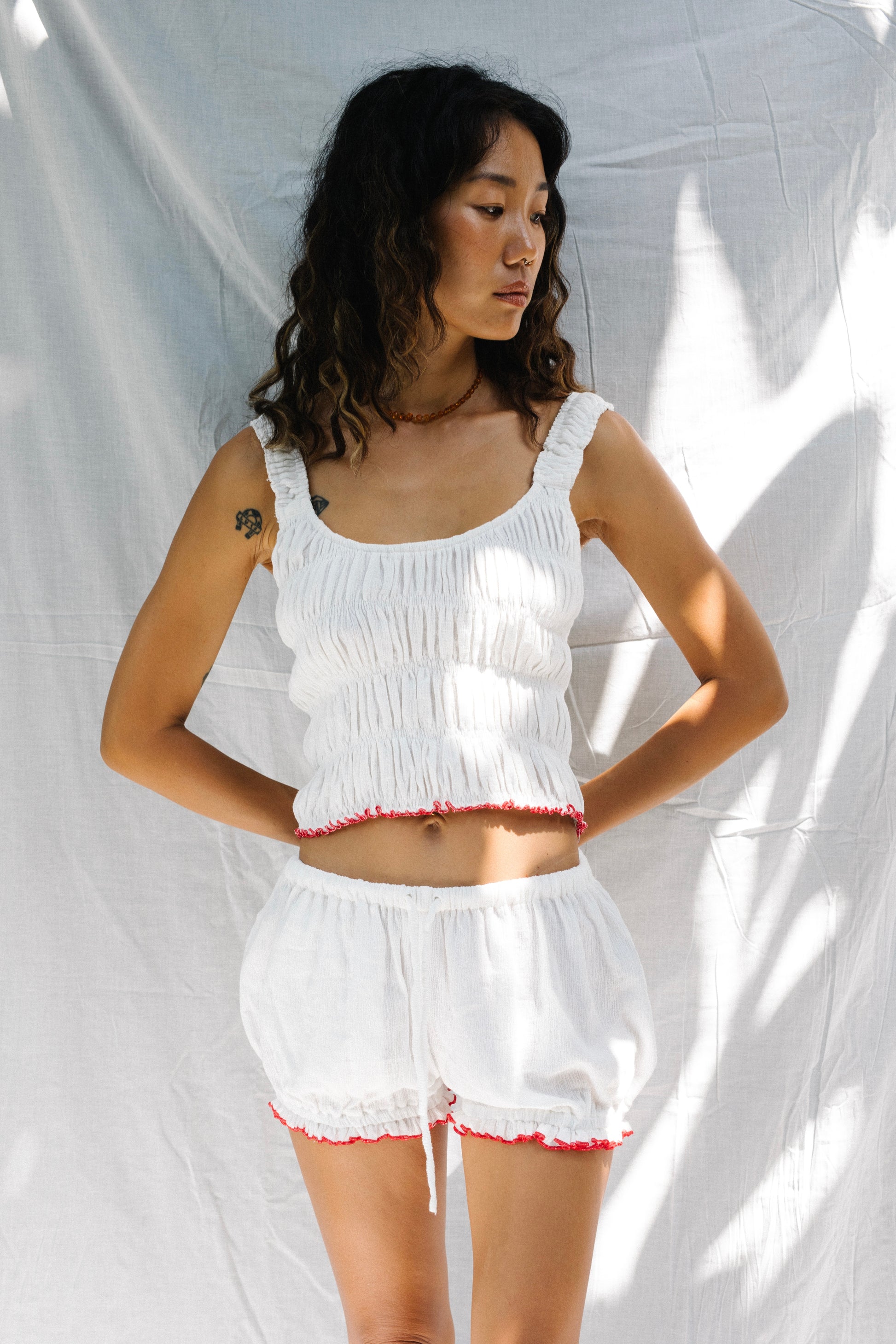 I chose this fabric because of the beautiful texture and durability & not too sheer compare to our other white pieces :) 'Kaba' is crafted from 100% cotton, ensuring it’s soft and comfortable all day long. The textured fabric adds a unique touch, while the playful red overlocking gives it a fun, colourful finish. The shirred sewing technique creates a cute and snug fit, making it perfect for everyone.