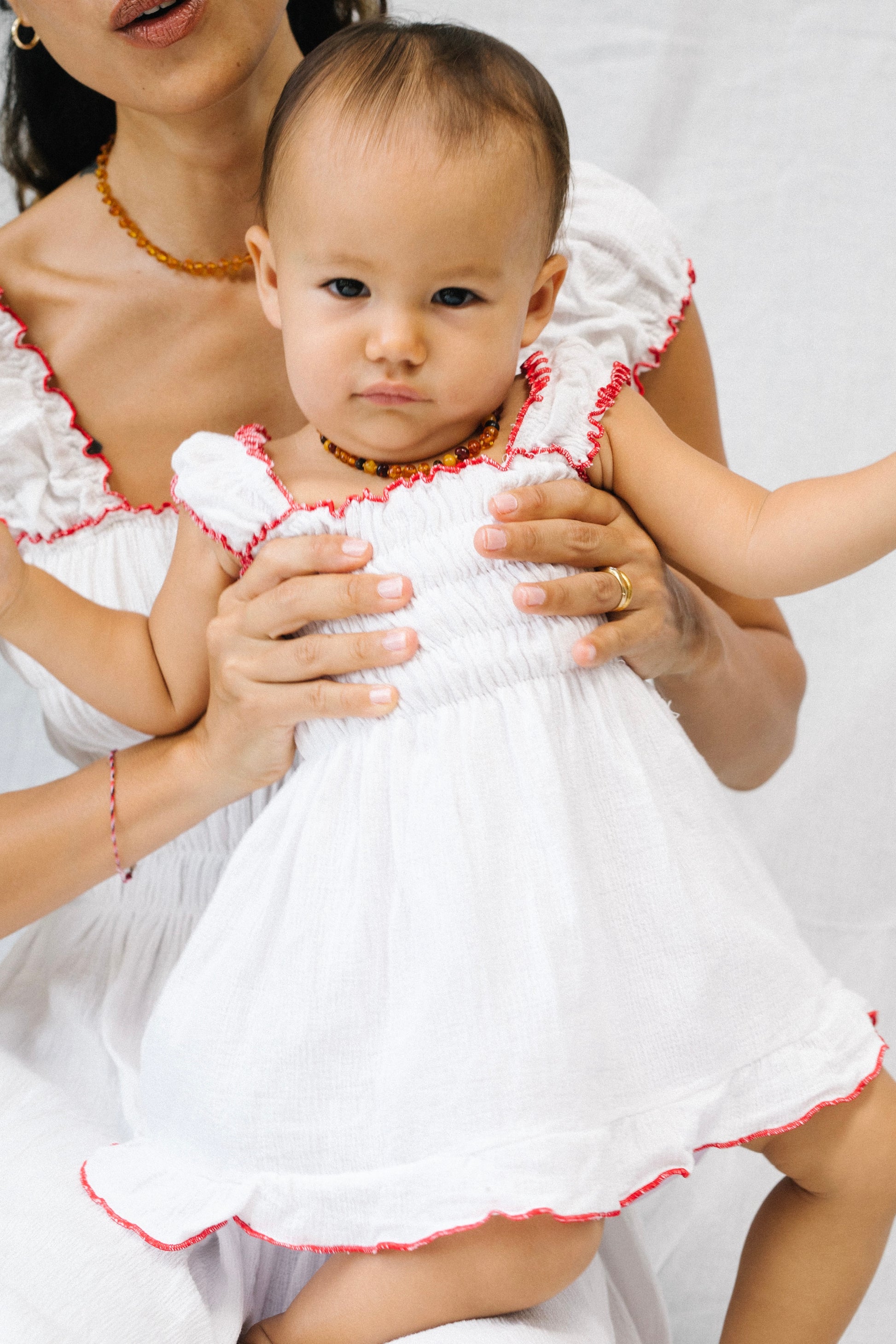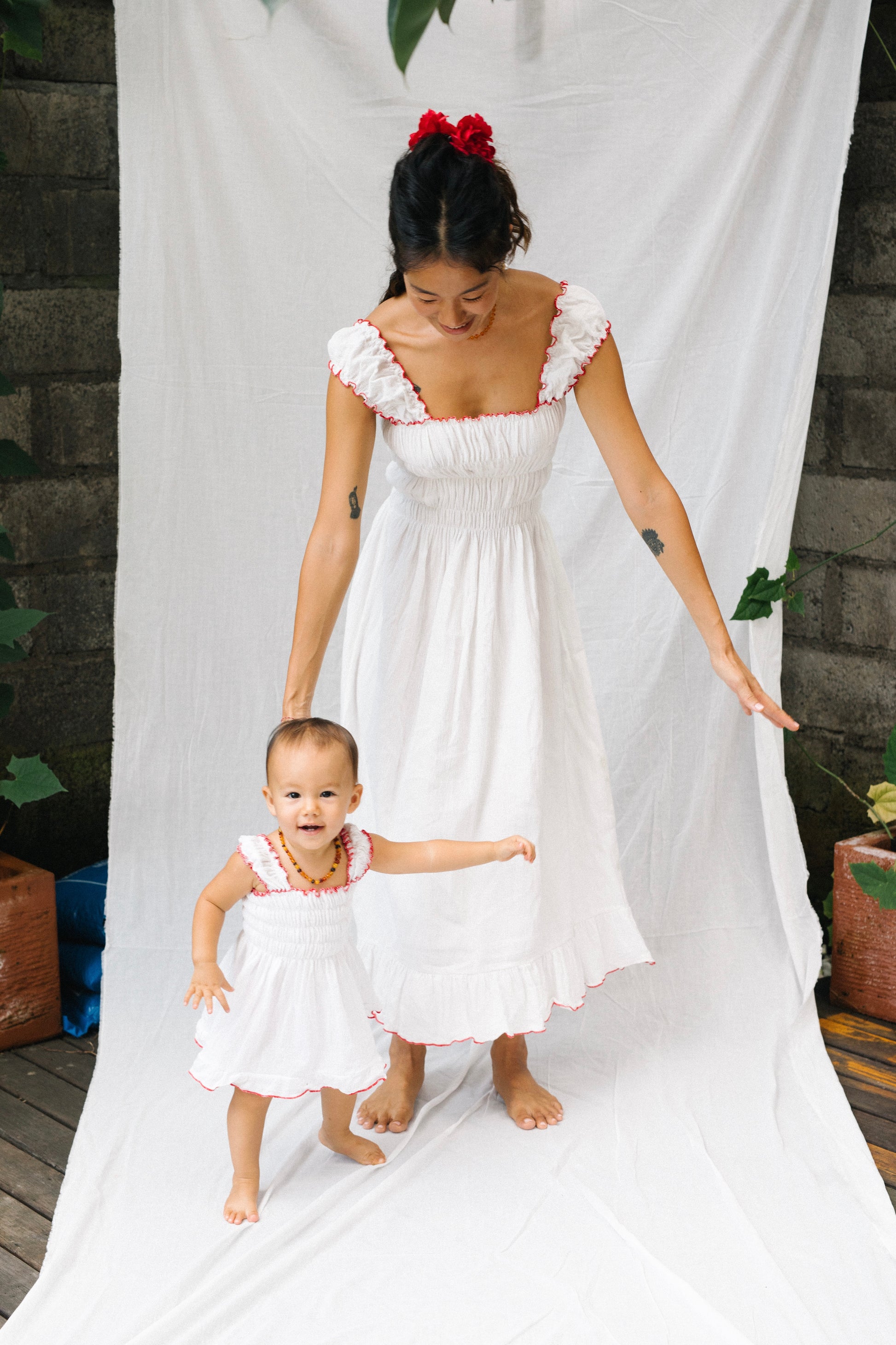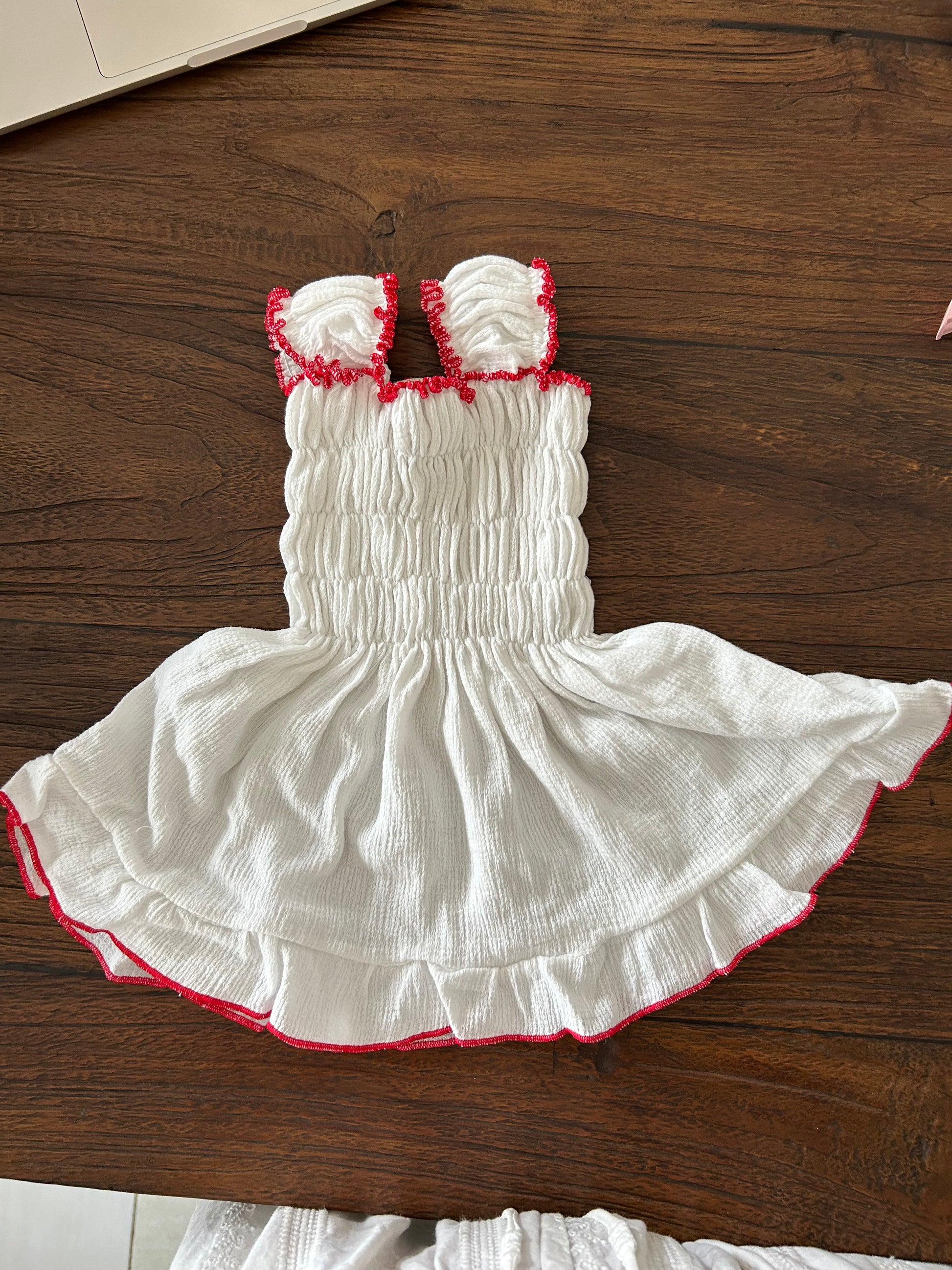 I chose this fabric because of the beautiful texture and durability & not too sheer compare to our other white pieces :) 'Kaba' is crafted from 100% cotton, ensuring it’s soft and comfortable all day long. The textured fabric adds a unique touch, while the playful red overlocking gives it a fun, colourful finish. The shirred sewing technique creates a cute and snug fit, making it perfect for everyone.