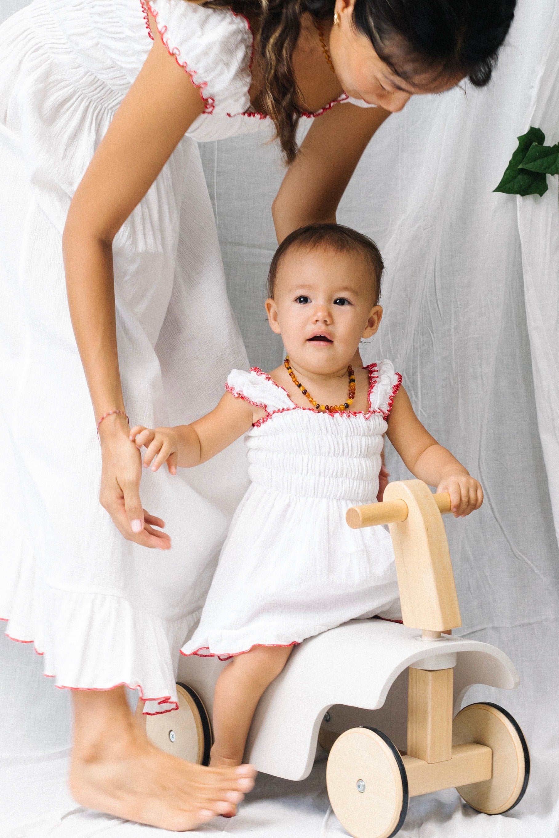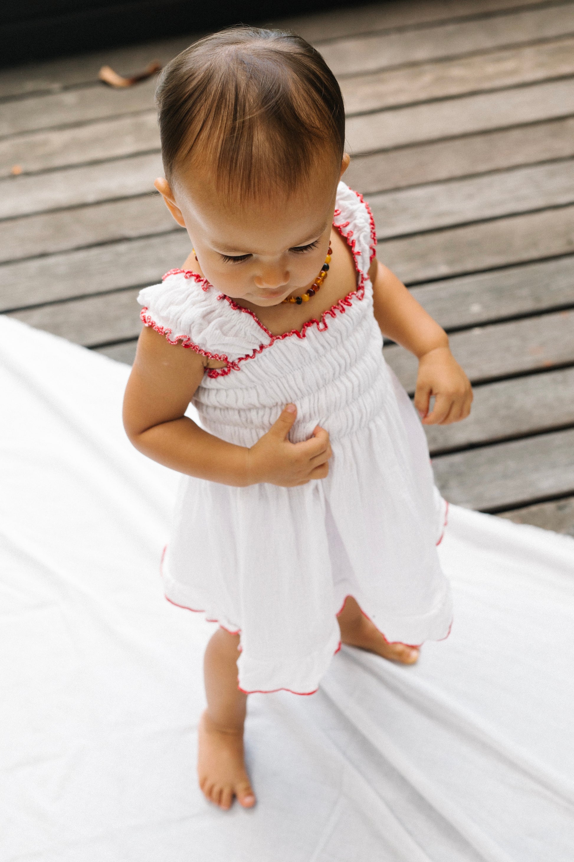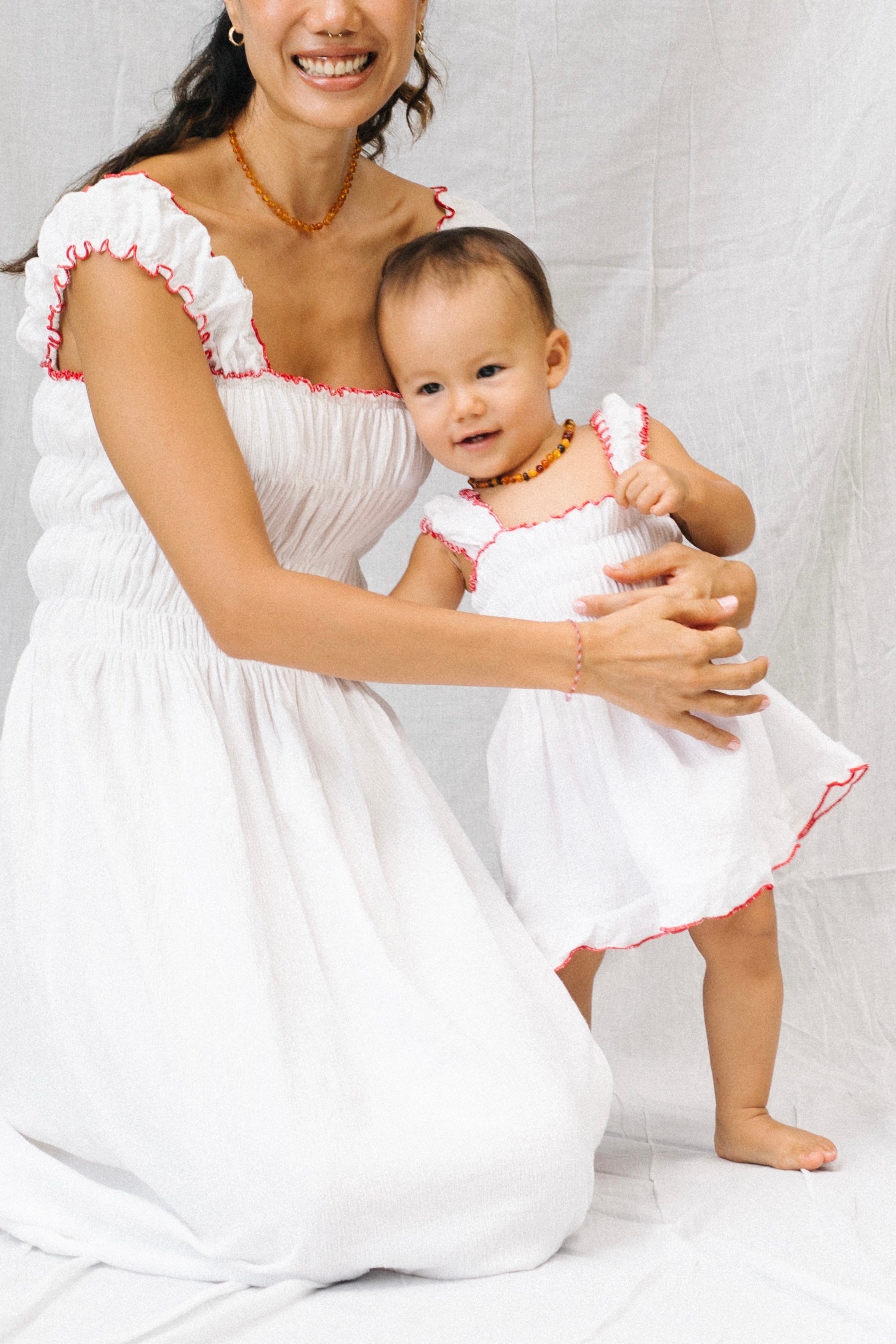 I chose this fabric because of the beautiful texture and durability & not too sheer compare to our other white pieces :) 'Kaba' is crafted from 100% cotton, ensuring it’s soft and comfortable all day long. The textured fabric adds a unique touch, while the playful red overlocking gives it a fun, colourful finish. The shirred sewing technique creates a cute and snug fit, making it perfect for everyone.