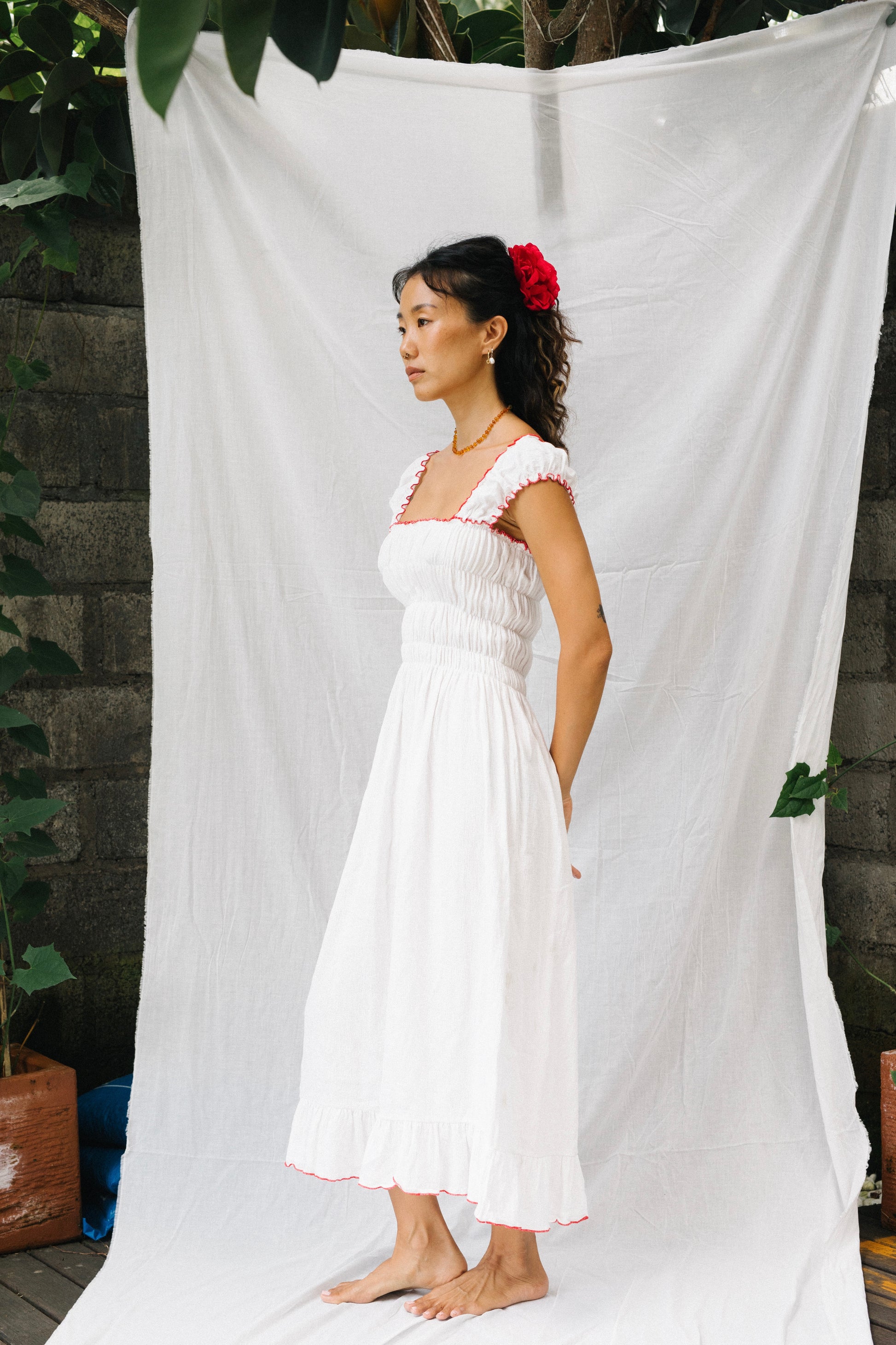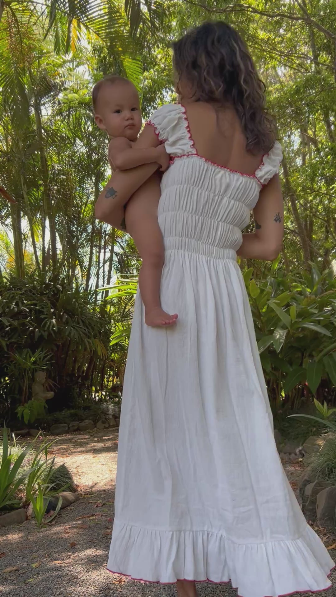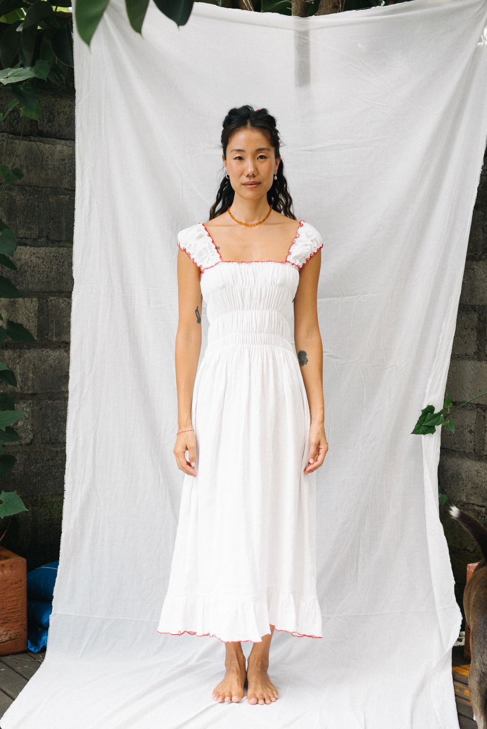I chose this fabric because of the beautiful texture and durability & not too sheer compare to our other white pieces :) 'Kaba' is crafted from 100% cotton, ensuring it’s soft and comfortable all day long. The textured fabric adds a unique touch, while the playful red overlocking gives it a fun, colourful finish. The shirred sewing technique creates a cute and snug fit, making it perfect for everyone.