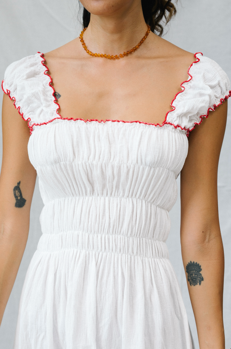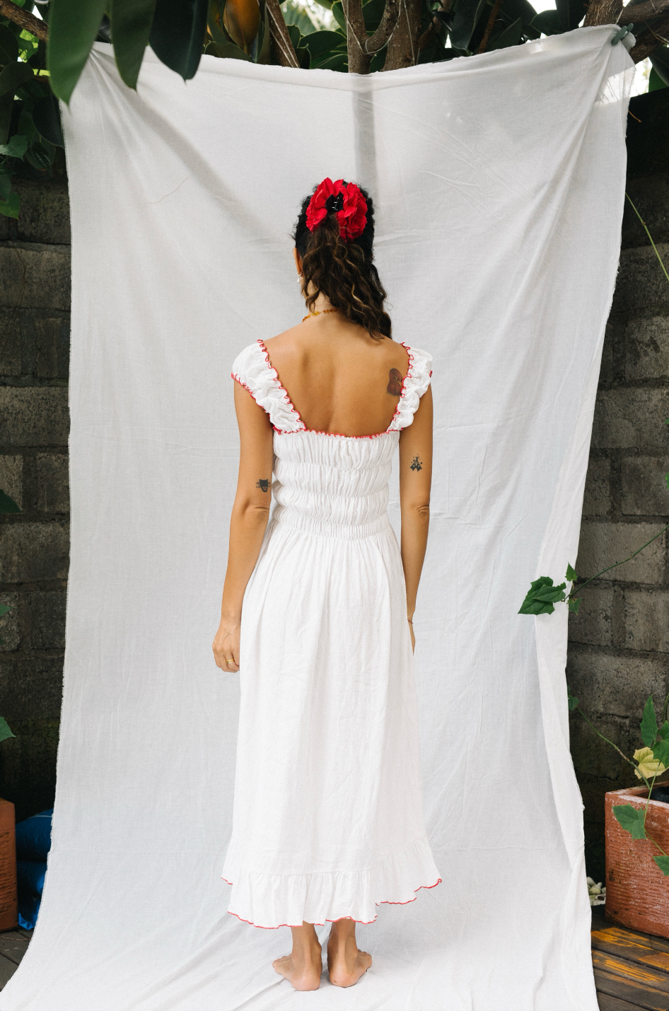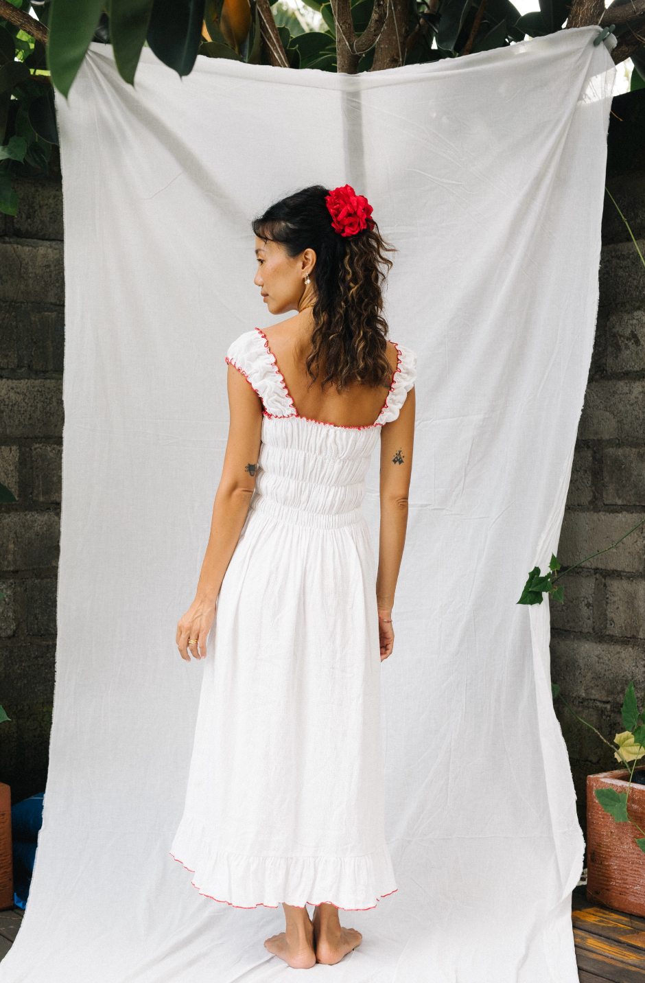 I chose this fabric because of the beautiful texture and durability & not too sheer compare to our other white pieces :) 'Kaba' is crafted from 100% cotton, ensuring it’s soft and comfortable all day long. The textured fabric adds a unique touch, while the playful red overlocking gives it a fun, colourful finish. The shirred sewing technique creates a cute and snug fit, making it perfect for everyone.