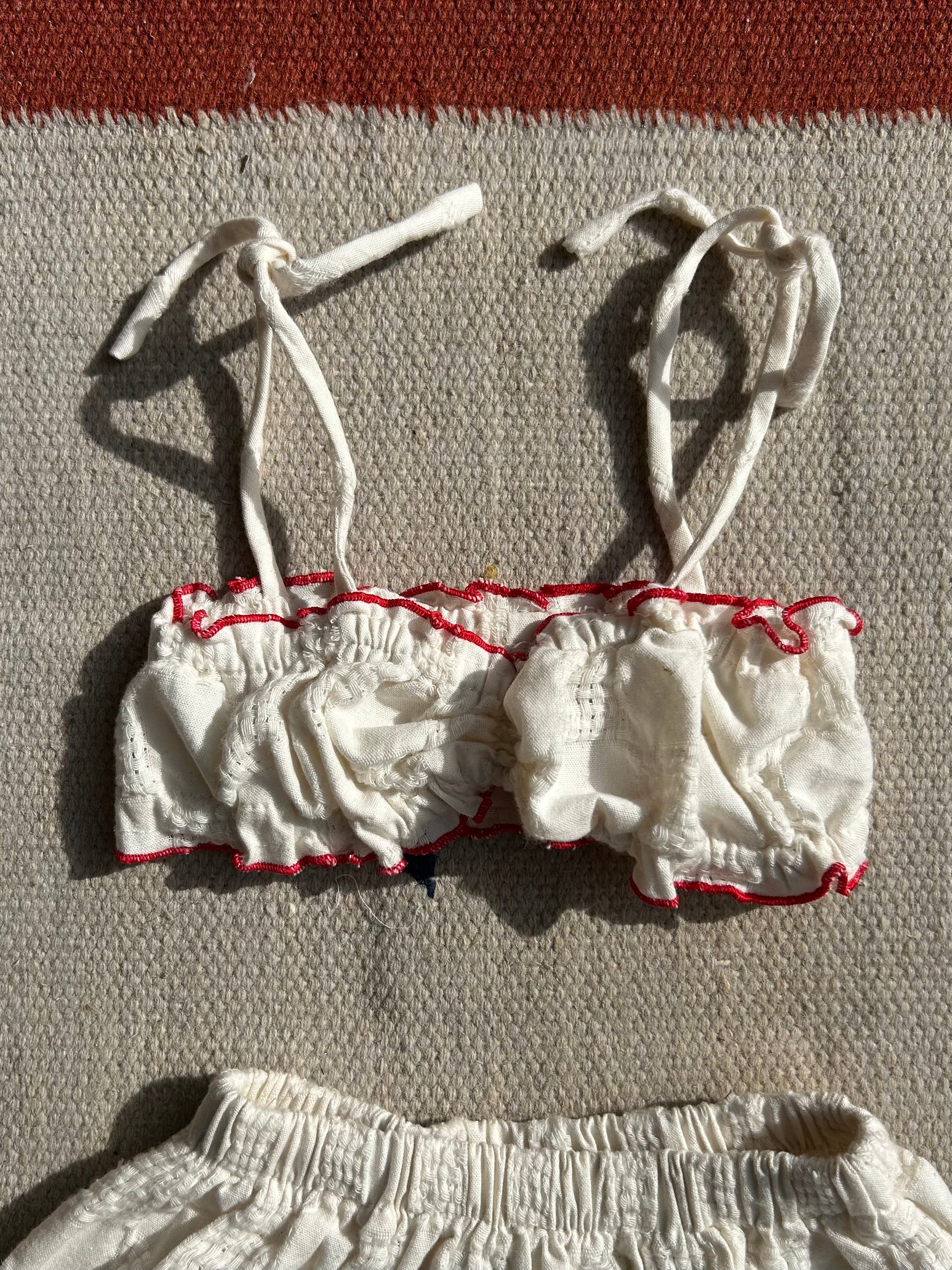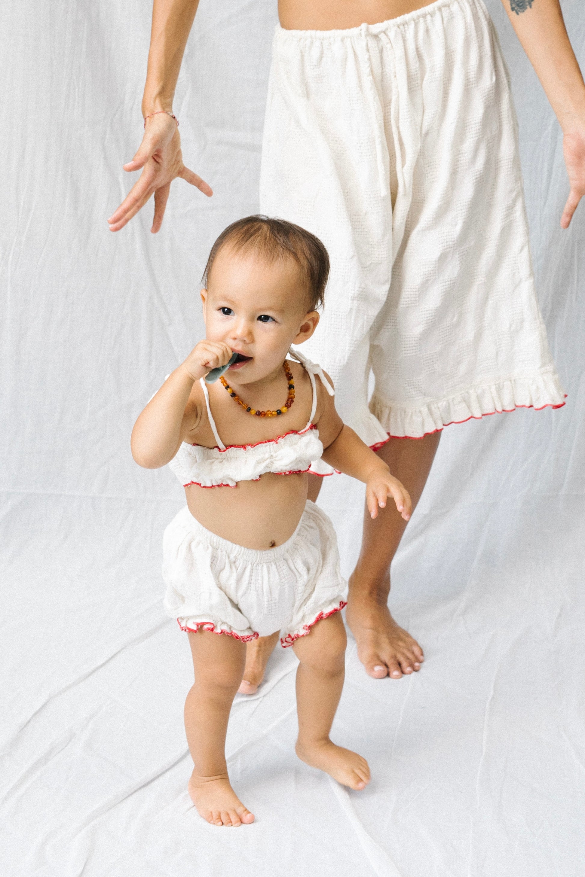Made from 100% soft, breathable cotton, this adorable 'Sunshine' is designed with comfort in mind. The fabric features charming cotton patch details, adding a playful touch which I love to do. 'Sunshine' is finished with red overlocking stitching, offering a unique pop of colour and the ruffle is the theme :)