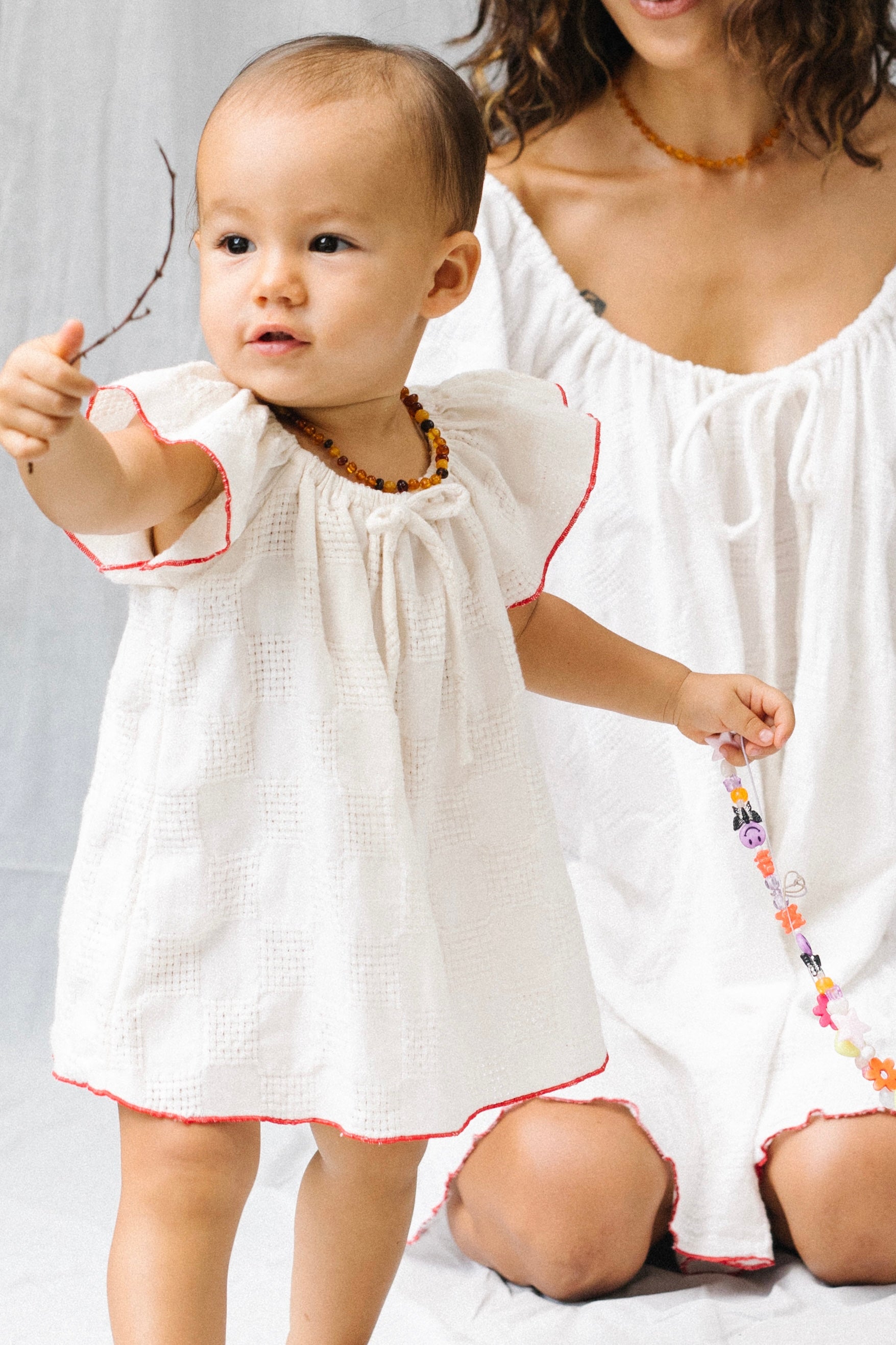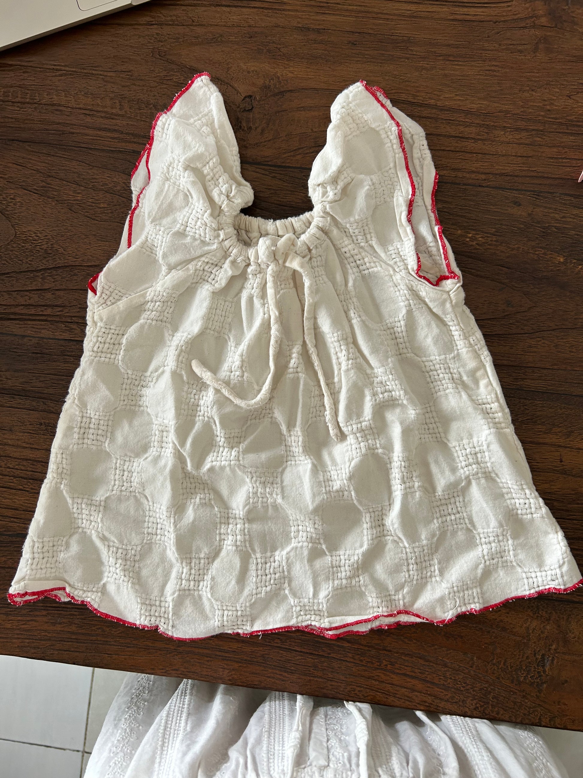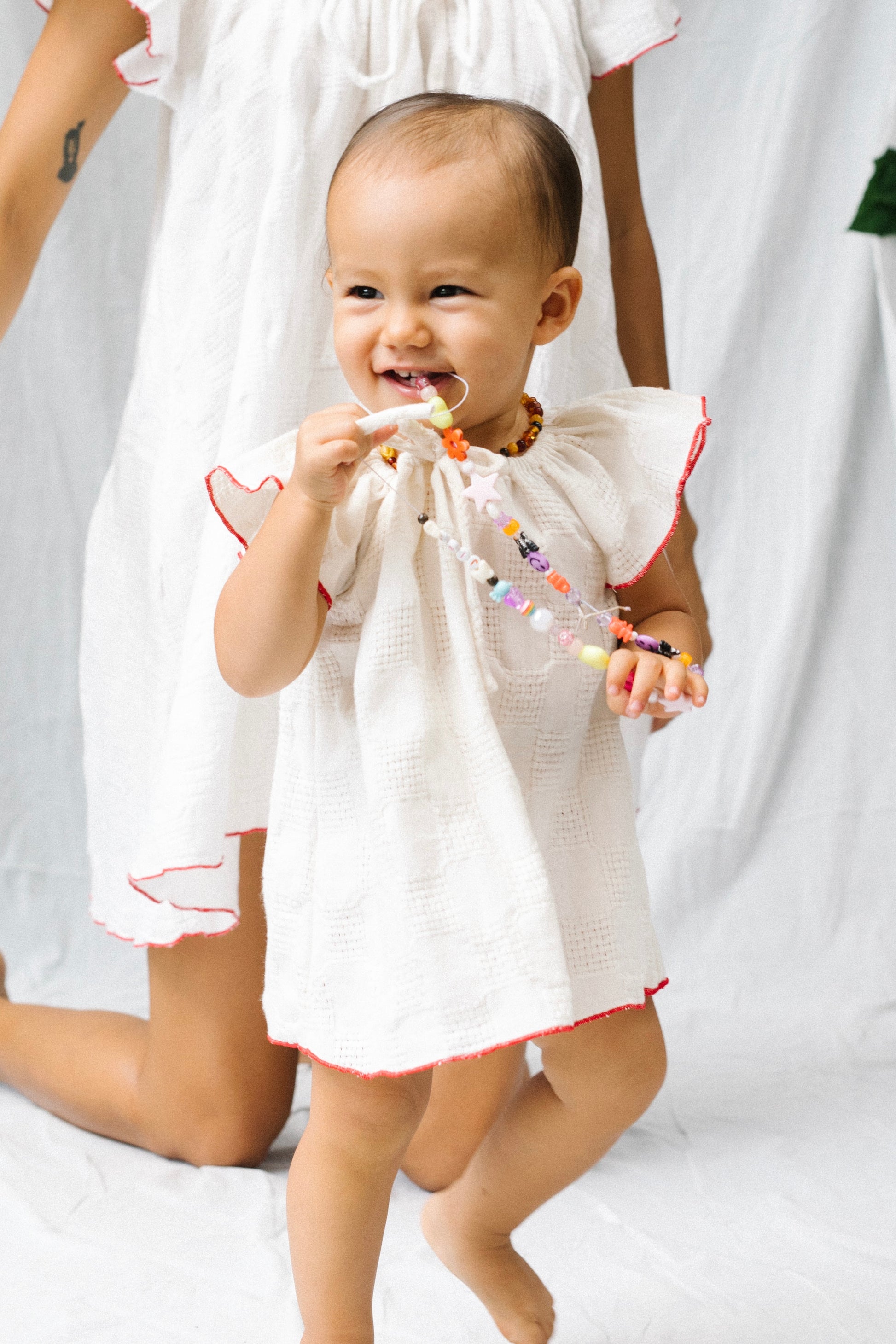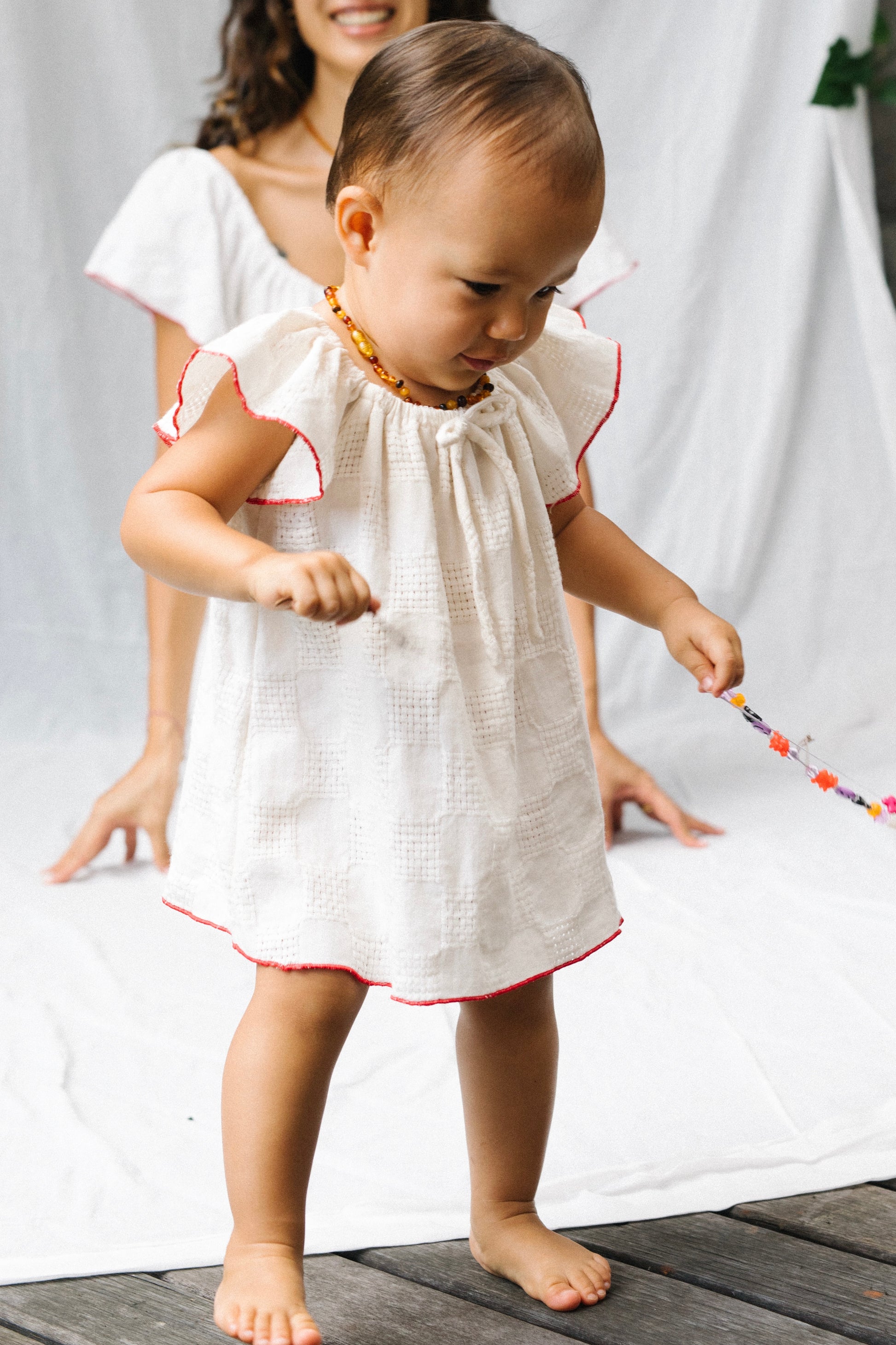 Made from 100% soft, breathable cotton, this adorable 'Sunshine' is designed with comfort in mind. The fabric features charming cotton patch details, adding a playful touch which I love to do. 'Sunshine' is finished with red overlocking stitching, offering a unique pop of colour and all about the ruffle this time :)