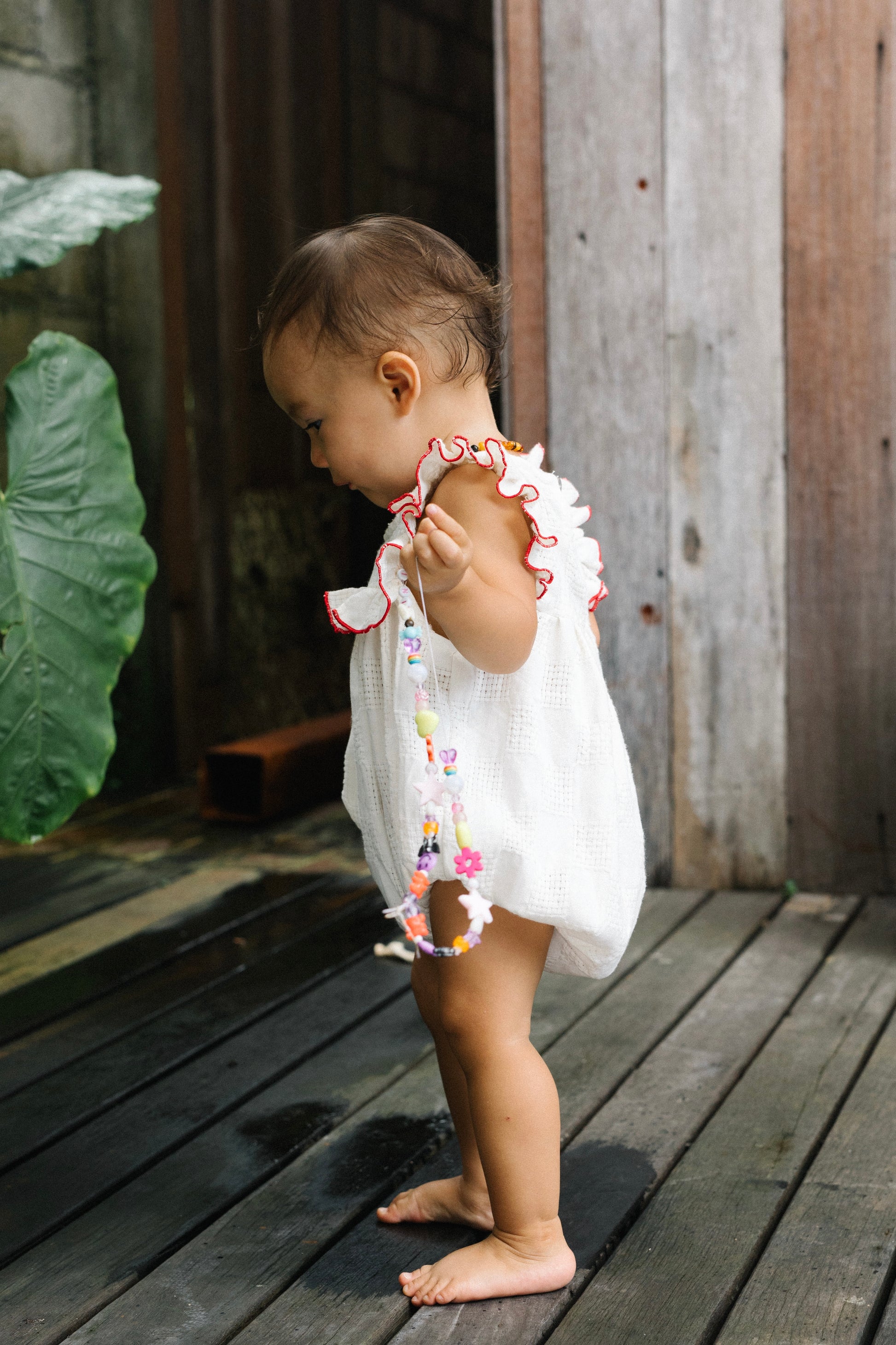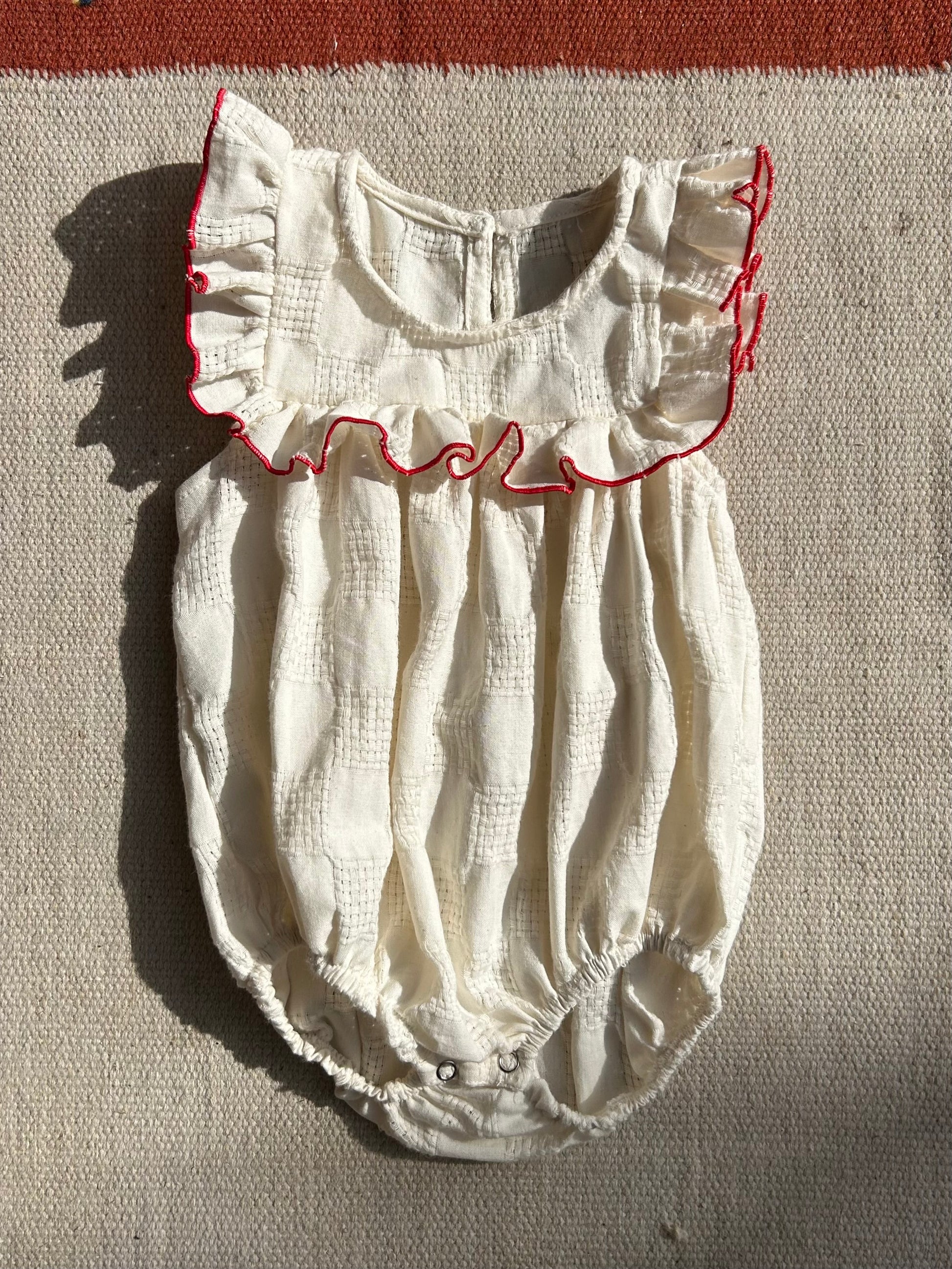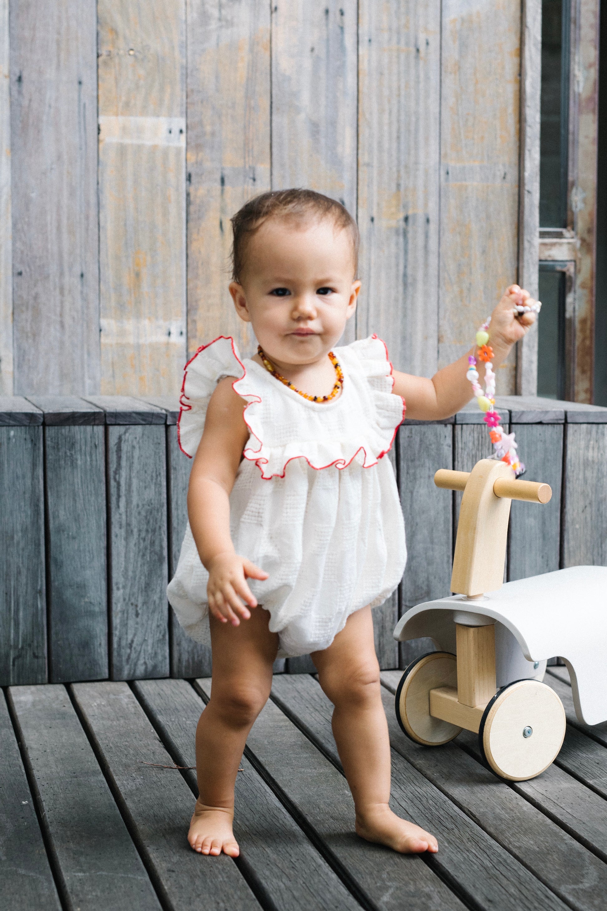 Made from 100% soft, breathable cotton, this adorable 'Sunshine' is designed with comfort and style in mind. The fabric features charming cotton patch details, adding a playful touch which I love to do. 'Sunshine' is finished with red overlocking stitching, offering a unique pop of colour and all about the ruffle this time :)