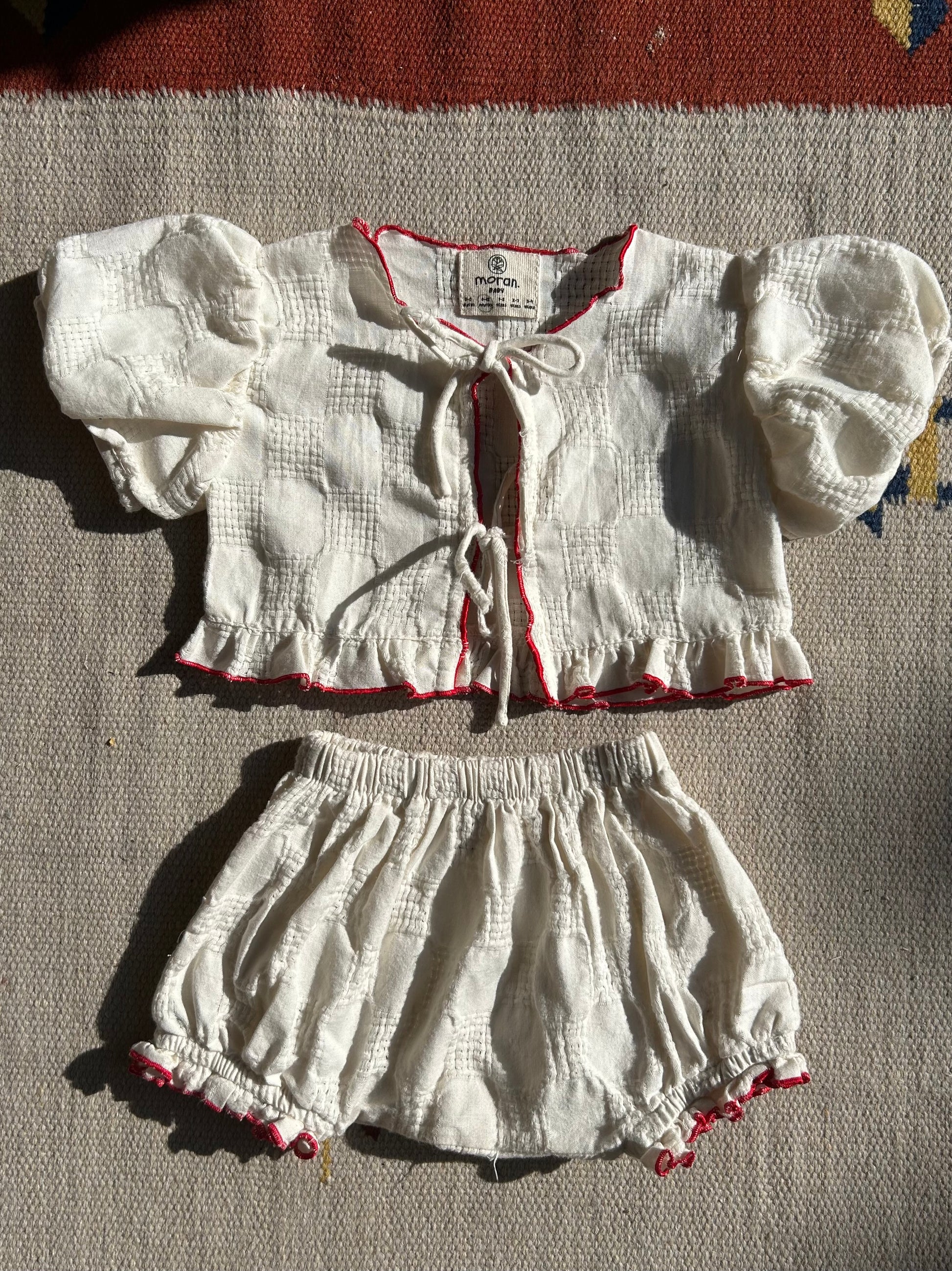 Made from 100% soft, breathable cotton, this adorable 'Sunshine' is designed with comfort in mind. The fabric features charming cotton patch details, adding a playful touch which I love to do. 'Sunshine' is finished with red overlocking stitching, offering a unique pop of colour and all about the ruffle this time :)