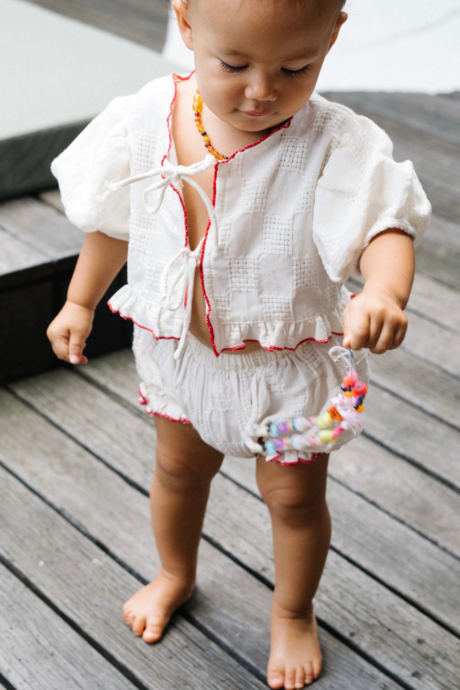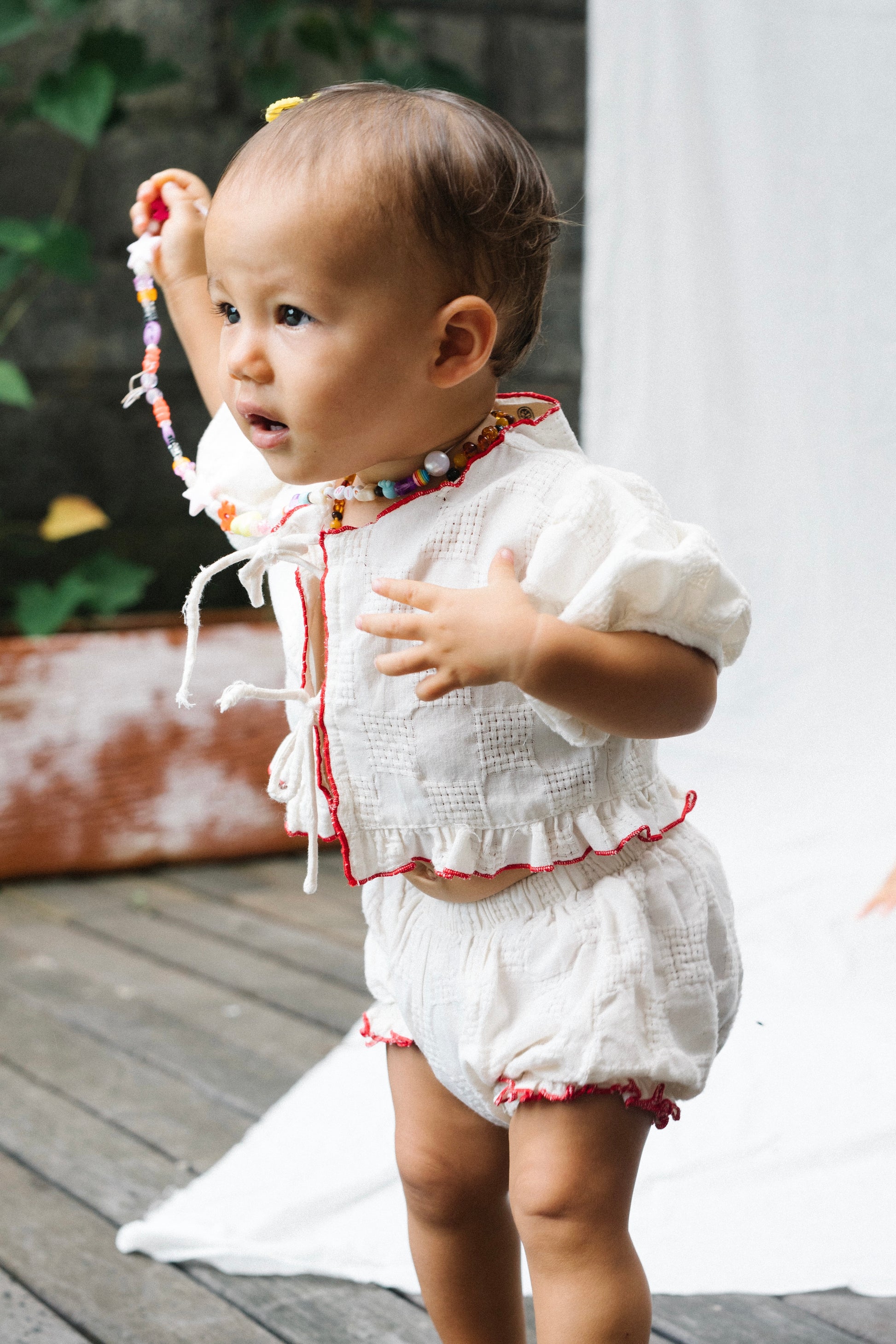 - Red baby overlocking finish